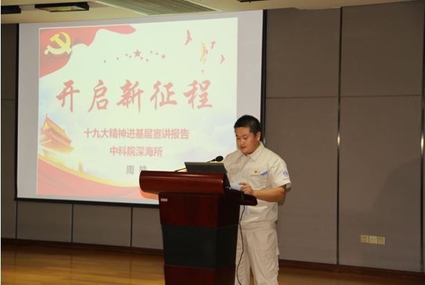11月1日上午,中國科學院深海科學與工程研究所在十樓報告廳舉行黨的十九大精神宣講報告會,十九大代表周皓同志作宣講報告,全所成員近100人參加會議。?