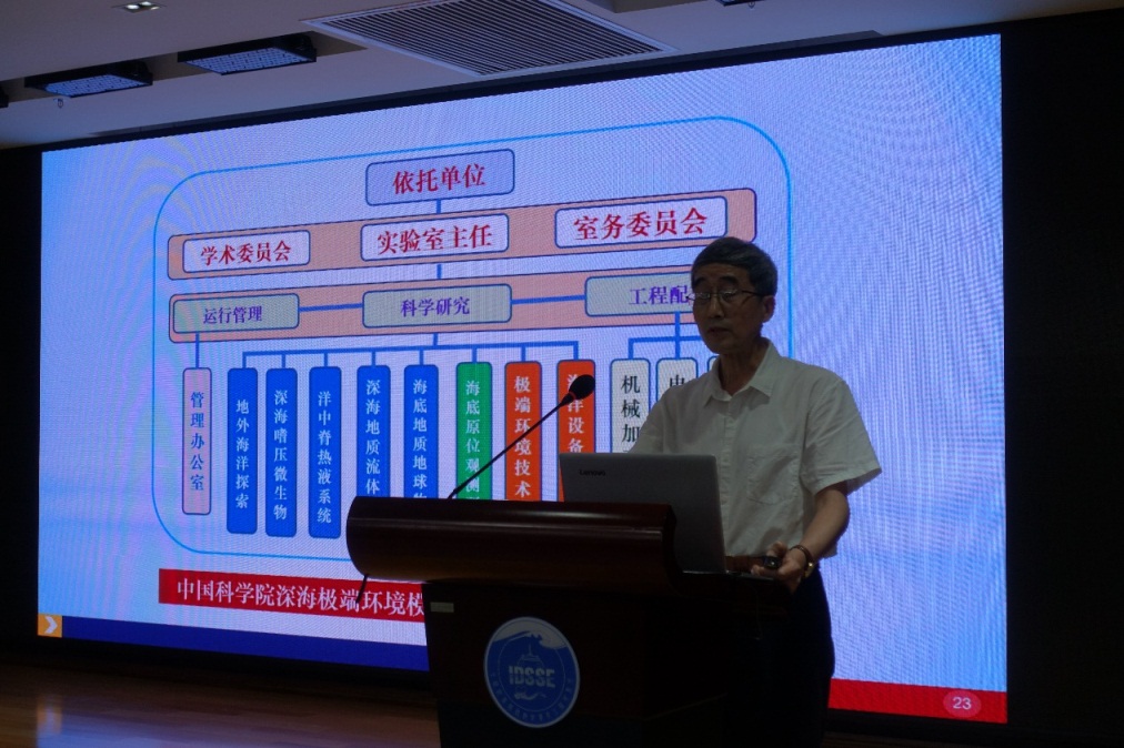 驗(yàn)收論證會(huì)上,重點(diǎn)實(shí)驗(yàn)室主任梅升華研究員代表重點(diǎn)實(shí)驗(yàn)室做了驗(yàn)收?qǐng)?bào)告,向?qū)<医M和院機(jī)關(guān)領(lǐng)導(dǎo)介紹了籌建期內(nèi)重點(diǎn)實(shí)驗(yàn)室的建設(shè)情況。周義明研究員、蔣磊正高級(jí)工程師和張維佳副研究員分別在室內(nèi)極端環(huán)境模擬手段、深海超高壓模擬實(shí)驗(yàn)裝置和深海微生物適應(yīng)性機(jī)制三個(gè)方向做了學(xué)術(shù)報(bào)告,充分展示了重點(diǎn)實(shí)驗(yàn)室的研究?jī)?yōu)勢(shì)和學(xué)科特色。