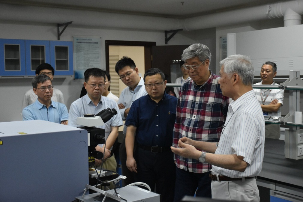 周義明研究員向?qū)<医M介紹激光拉曼實(shí)驗(yàn)室