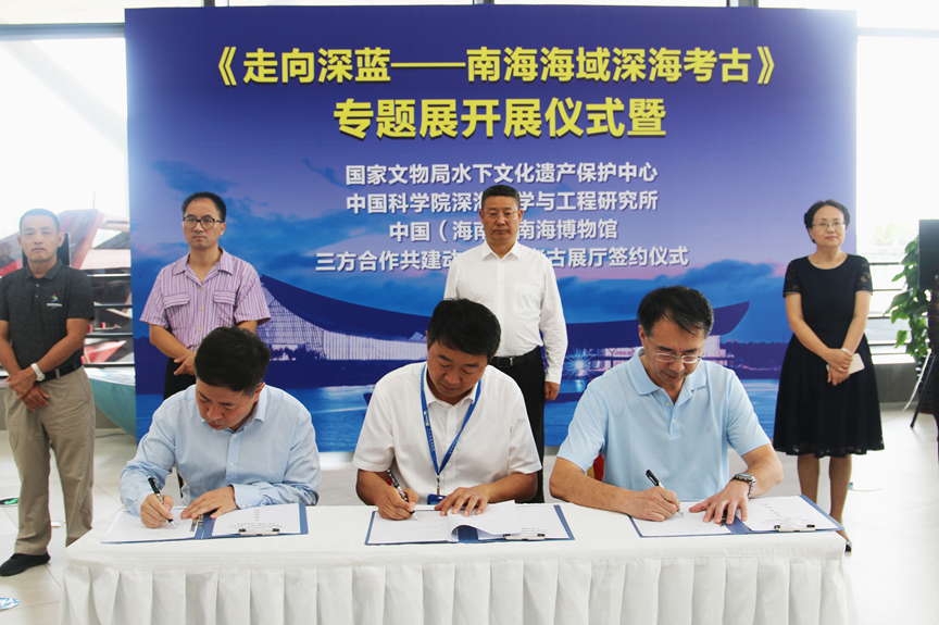 2019年3月22日上午,《走向深藍——南海海域深海考古》專題展開展儀式暨國家文物局水下文化遺產保護中心、中國科學院深海科學與工程研究所、中國(海南)南海博物館三方合作共建動態水下考古展廳簽約儀式在中國(海南)南海博物館順利舉行。