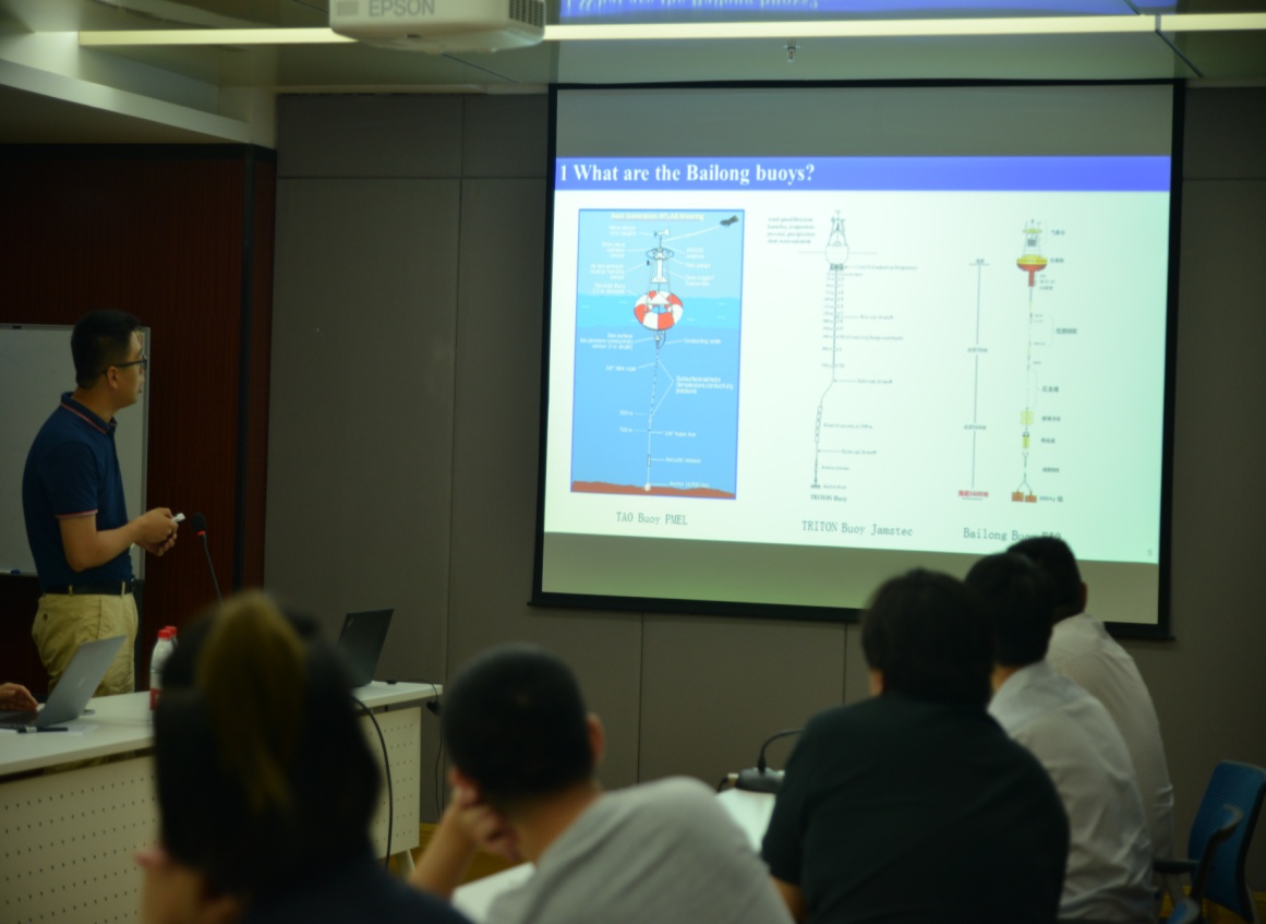報(bào)告中,于衛(wèi)東研究員就季風(fēng)的季節(jié)循環(huán)、季節(jié)內(nèi)震蕩、季風(fēng)爆發(fā)和熱帶氣旋等問題展開闡述,指出了季風(fēng)預(yù)報(bào)的困難性。寧春林研究員則分別闡述了白龍浮標(biāo)的結(jié)構(gòu)、工作原理、使用流程、數(shù)據(jù)采集過程以及目前的布放次數(shù)與獲取的數(shù)據(jù)。報(bào)告引起了所內(nèi)不同學(xué)科科研人員極大的興趣,會后進(jìn)行了熱烈的討論。