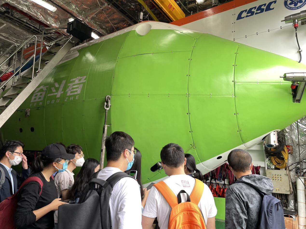 2月15日上午,同學們參觀了探索一號科考船和“奮斗者”號載人潛器,近距離走進深海探測的大國重器,并向潛航員學習了有關下潛的知識,和船長交流了出海科考經驗。