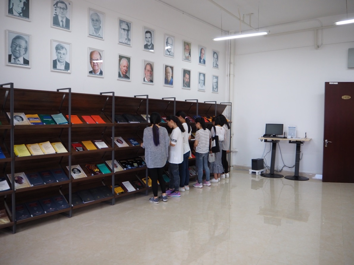 下午14:10,職工支部團員抵達位于三亞鳳凰機場附近的清華三亞國際數學論壇。在論壇工作人員的指引下,職工支部成員參觀了會議室、外文圖書室、中文圖書室、茶歇區和頂樓觀景臺。活動過程中,一樓茶歇區樓頂環繞陳列的菲爾茲數學獎獲得者的波普照片給大家留下了深刻印象。陳列有歷屆菲爾茲數學獎獲獎者著作的圖書室,以及充滿清華情懷的中文圖書室,讓大家沉浸在知識的海洋之中,流連忘返。據論壇工作人員介紹,論壇圖書室建筑總面積664.5平方米,藏書約1萬冊,外文書刊主要為數學類專業刊物,中文書刊包括社科、科技類等。