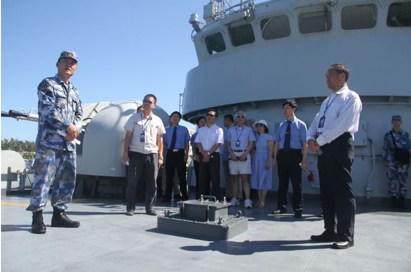 七月的三亞,滿目蒼翠,碧海藍天,軍港內一艘艘戰艦在碧波青山前顯得尤為雄偉壯觀。此次教育活動參觀的戰艦為綿陽艦。據介紹,綿陽艦是中國自行設計建造的新型導彈護衛艦,該艦曾赴亞丁灣、索馬里海域執行護航任務。在官兵的帶領下,大家先后參觀了反艦、防空、反潛等各式武器裝備,了解各類武器性能,近距離觀察體會了近年來海軍建設發展取得的輝煌成就。