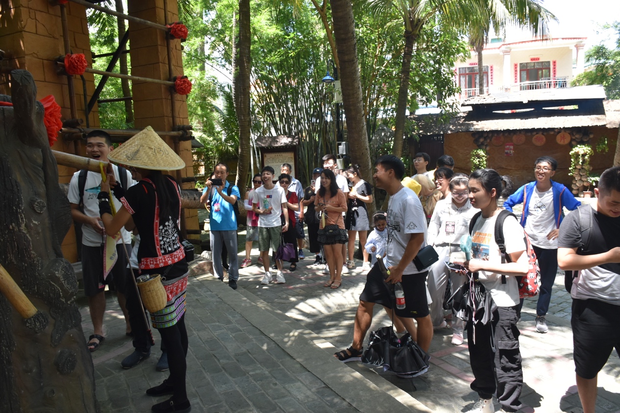 大家陸續參觀了椰田古寨,感受黎族風情,聽黎族阿妹講述他們的民俗傳統。在經濟飛速發展的當代,人與自然和諧相處更加難能可貴,在這個小小的村寨里,沒有空調、鋼筋混凝土等現代化的產物,老人家親手編織竹簍、帽子等生活用品,年輕人跟隨老師傅學習銀器簪花等傳統手藝,抬頭一看住屋上懸掛幾個大字“綠水青山就是金山銀山”,習近平總書記的科學論斷在這個村寨得到完美詮釋。?