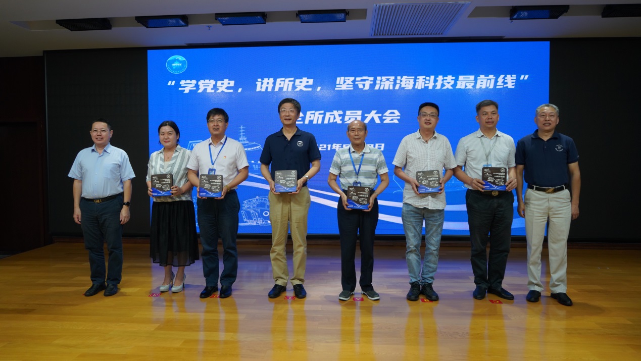 升旗儀式結(jié)束后,在學術報告廳組織召開“學黨史,講所史,堅守深??萍甲钋熬€”成員大會。黨委委員、副所長彭曉彤主持會議。會上,集中觀看深海所十周年歷程視頻,黨委副書記(主持工作)、副所長陽寧和副所長許惠平為2011年入所的職工頒發(fā)了入所十周年章。隨后,原籌建組組長王越超、副組長戴瓊興分別回顧了深海所籌建期的故事;周義明、唐古拉山、鄧玉清、蔣磊、周皓分別結(jié)合自身工作,分享在所工作的經(jīng)歷和感受。