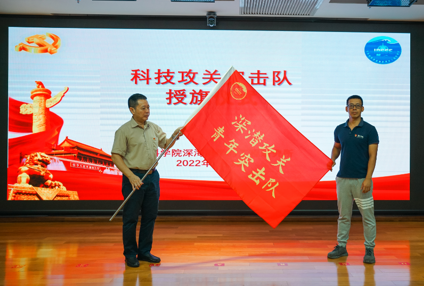 會上還舉行了科技攻關突擊隊授旗儀式。陽寧為深?;竟リP突擊隊、海底移動作業平臺攻關突擊隊、深潛攻關青年突擊隊、深淵科學攻關突擊隊授旗。?
