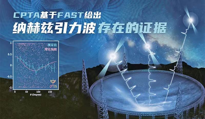 中國脈沖星測時陣列(CPTA)研究團隊,利用被譽為“中國天眼”的500米口徑球面射電望遠鏡(FAST),發(fā)現(xiàn)納赫茲引力波存在的關(guān)鍵性證據(jù)。圖為這一發(fā)現(xiàn)的示意圖。 中國科學(xué)院供圖