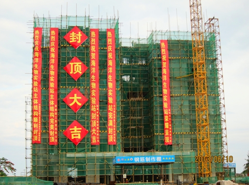 海洋生物實驗站大樓共7層,建筑面積7863.24平方米,自2012年9月27日開工建設以來, 在三亞深海所基本建設辦公室及施工單位、監理方的共同努力下,歷經246個日日夜夜的緊張施工,至此如期封頂。海洋生物實驗站大樓順利封頂標志著項目建設取得階段性成果,下一步將陸續展開砌體工程、水電及設備安裝和外墻裝修等工作。