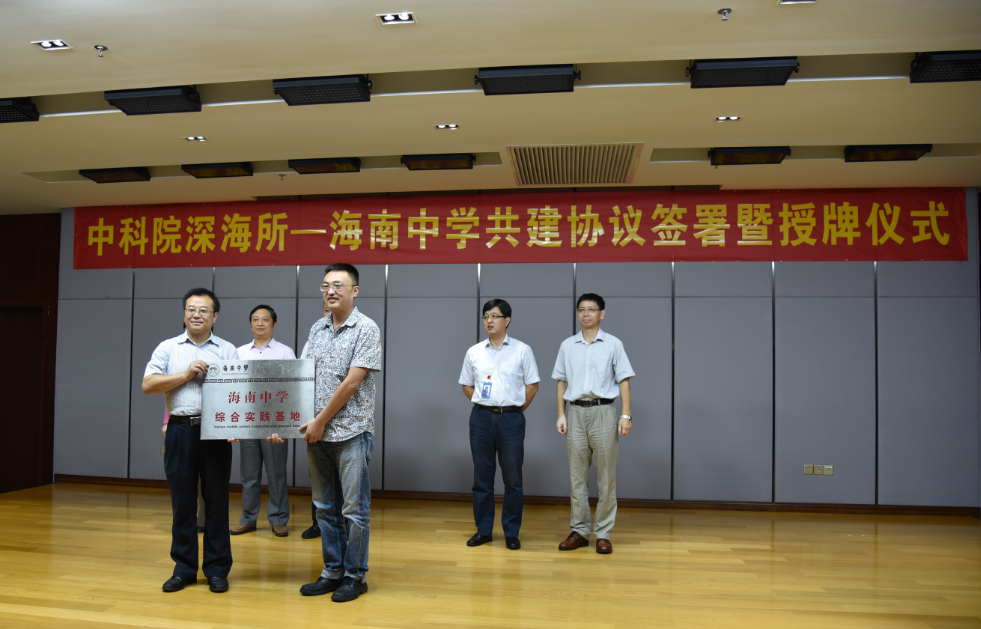 201611月24日,深海所與海南中學順利簽署合作共建協議暨 “海南中學綜合實踐基地” 授牌儀式。深海所副所長代亮、海南中學副校長林洪珊、三亞市教育局局長陳鵬程分別致辭。深海所副所長謝強、所長助理張忠,海南中學校長馬向陽、副校長陳輝等領導及開展社會實踐活動的高二部分老師、學生參加了協議簽署與授牌儀式。