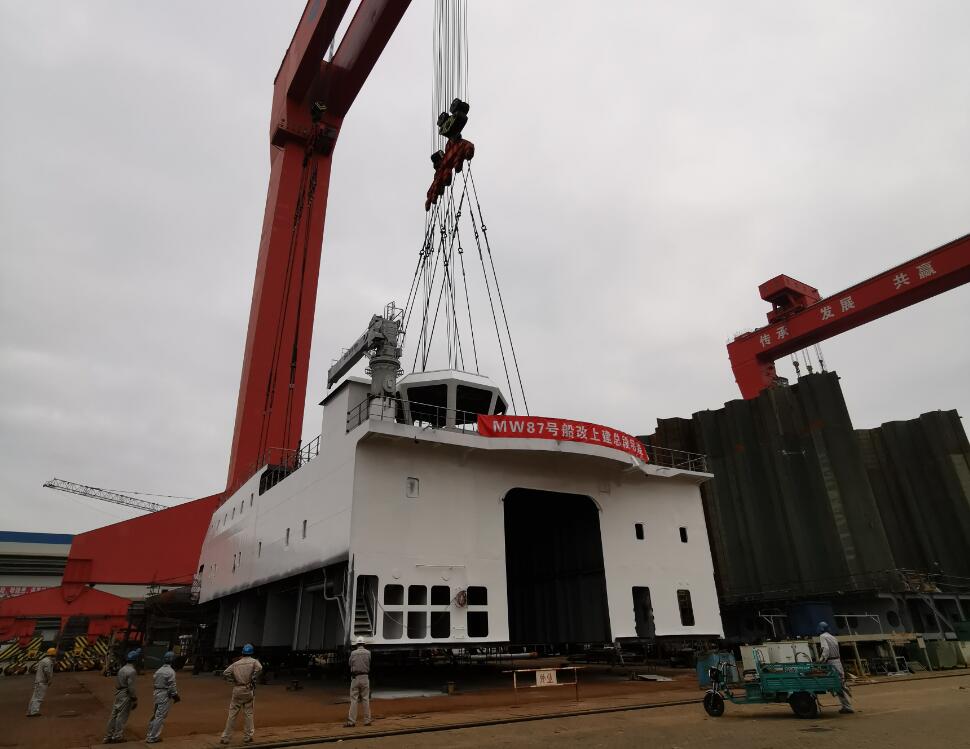 萬米載人潛水器支持保障母船上建總段吊裝完成