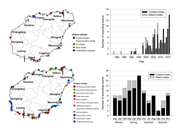 我國南海生物多樣性水平高,海洋哺乳動物資源豐富。通過記錄和分析擱淺事件,可為海洋哺乳動物研究和保護提供重要的基線信息。深海所海洋哺乳動物研究團隊收集了近三十余年海南島沿岸鯨豚擱淺事件,記錄到4種須鯨的7次擱淺事件,10種齒鯨的105次擱淺事件。四種須鯨分別為布氏鯨、鳀鯨、鰛鯨和大翅鯨,須鯨擱淺記錄優(yōu)勢種為布氏鯨;齒鯨擱淺記錄的優(yōu)勢種為熱帶斑海豚、印太江豚和短肢領航鯨。時空分析結果表明:海南東海岸比西海岸鯨類擱淺記錄多;擱淺記錄在年際上呈現(xiàn)增長趨勢,在季節(jié)上呈現(xiàn)出春季(3?5月)高發(fā)的趨勢。基于以上結果,本研究討論了海南島鯨類擱淺歷史,并進一步提出了研究、保護和管理方面的相關建議。