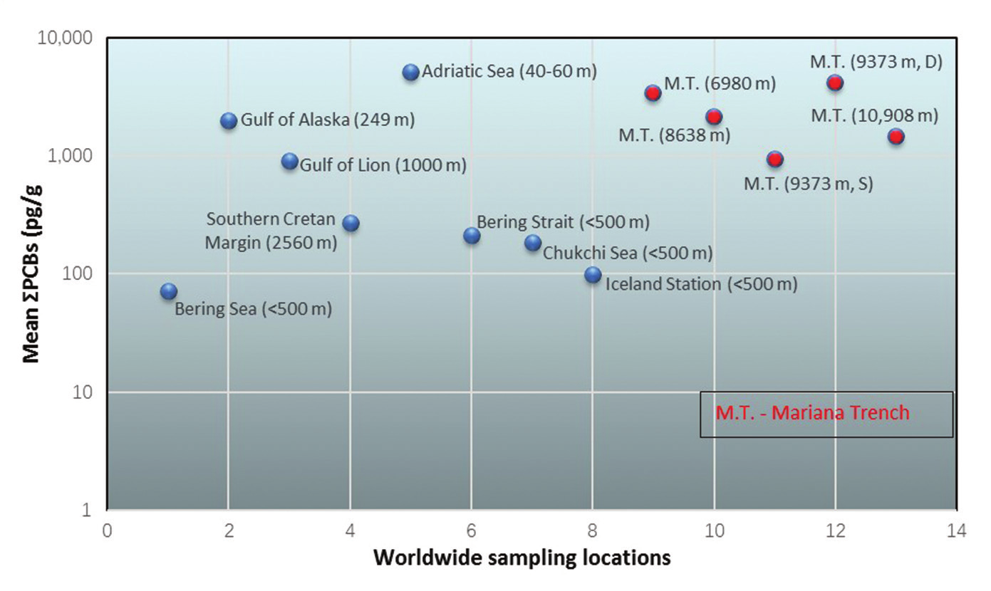 圖1 馬里亞納海溝與世界其它地區沉積物中多氯聯苯類總濃度對比