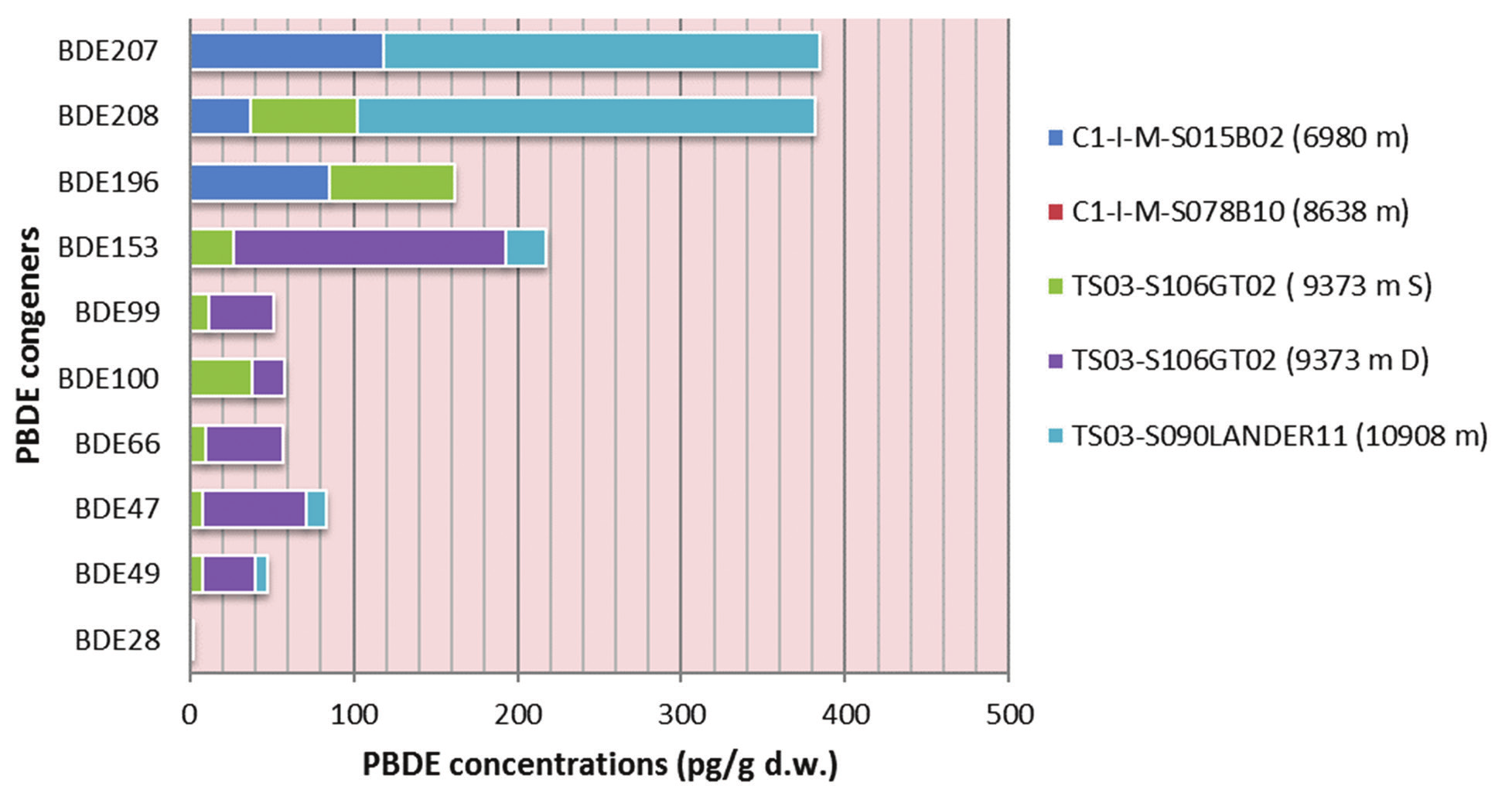 圖2 馬里亞納海溝底層不同樣品中多溴聯苯醚同系物的濃度