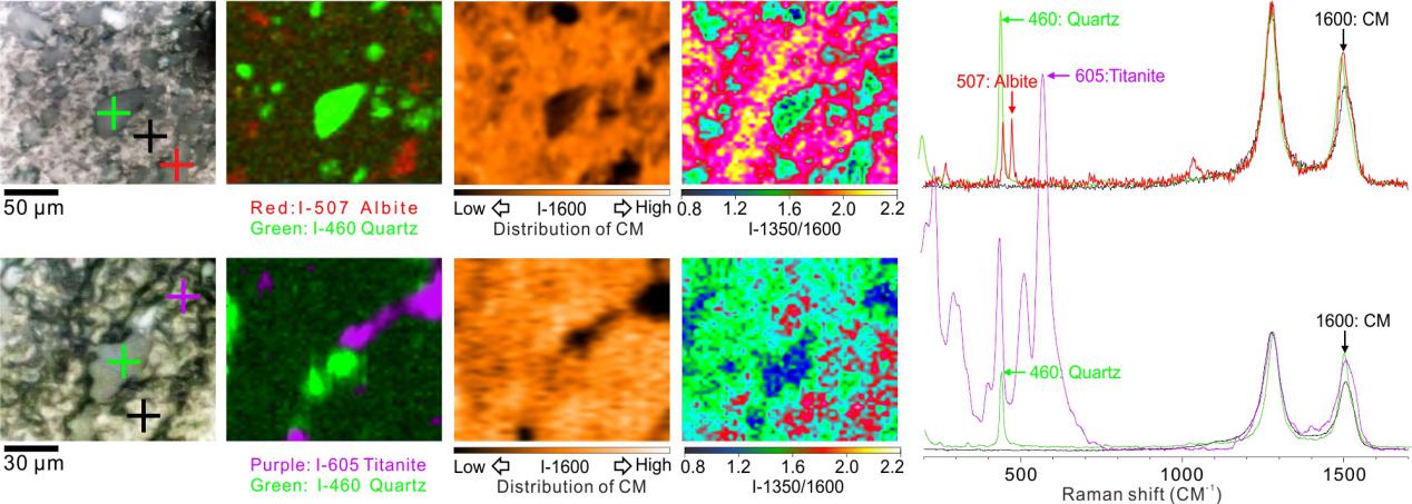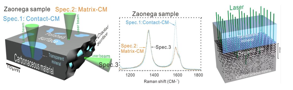 近日,地外海洋系統(tǒng)研究室屈原皋研究員及其團(tuán)隊運(yùn)用拉曼光譜學(xué)方法在古元古代(約20億年前)地層中發(fā)現(xiàn)熱液流體中有機(jī)分子以礦物為模板有序排列并在礦物表面組裝形成類似有機(jī)膜的結(jié)構(gòu)。此過程中受溫度、壓強(qiáng)、礦物晶型、表面電荷等綜合因素影響,最終導(dǎo)致礦物表面有機(jī)膜的分子有序度不同。