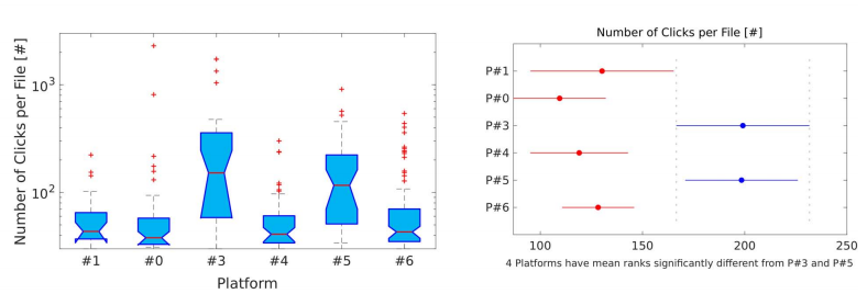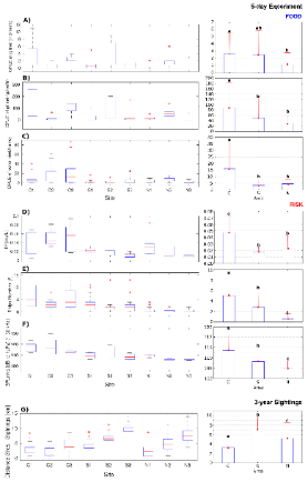 圖4 (左)被動聲學監(jiān)測位點和平臺(右)被動聲學監(jiān)測位點中每個文件檢測到的回聲定位信號次數(shù)和位點之間的差異