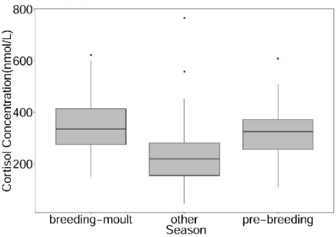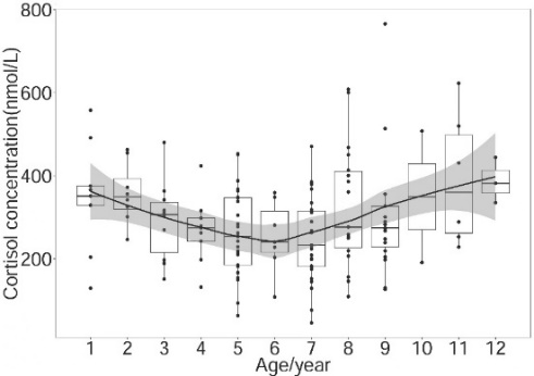 5.2020年5月11日,期刊Aquatic Mammals在線發(fā)表了題為“Aging and Seasonal Serum Cortisol Concentrations in Captive Spotted Seals (Phoca largha) from the Liaodong Bay Colony”的文章。研究團隊對遼東灣人工養(yǎng)殖斑海豹皮質(zhì)醇濃度積聚規(guī)律進行了分析并探討其在生殖周期中生理狀態(tài)的變化。研究表明,斑海豹皮質(zhì)醇水平隨年齡的增長緩慢降低并以6歲作為轉(zhuǎn)折點后緩慢升高(圖5 左);在性成熟和非性成熟期間,不同性別間皮質(zhì)醇濃度并無顯著差異,但在不同季節(jié)皮質(zhì)醇濃度存在顯著差異(圖5 右)。本研究為判斷野生斑海豹健康狀況建立了一個參考標準,同時可以用作評估其受自然或人為脅迫的壓力響應。