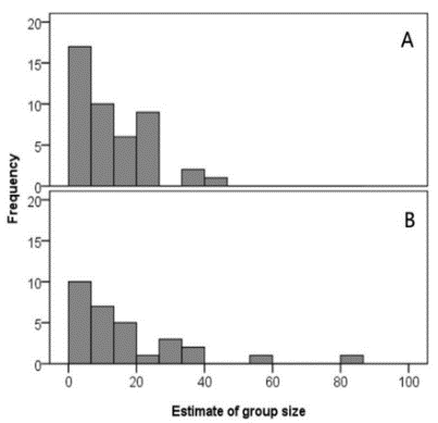 6.2020年5月11日,期刊Aquatic Mammals在線發(fā)表了題為“Group sizes of Indo-Pacific humpback dolphins in waters southwest of Hainan Island, China: Insights into rare records of large groups”的文章。研究團隊對海南島西南近岸水域(圖6左)中華白海豚的集群特征進行了調(diào)查。結(jié)果表明,海南中華白海豚種群平均集群規(guī)模比世界上許多已調(diào)查的駝海豚種群的集群規(guī)模都大,并且更偏向于集大群;相比于照相識別估計的集群規(guī)模,現(xiàn)場計數(shù)低估了海南中華白海豚集群規(guī)模,平均低估了25%左右(圖6右)。