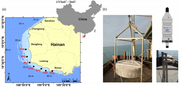 4.2020年4月28日,期刊Frontiers in Marine Science在線發(fā)表了題為“Monitoring of a nearshore small dolphin species using passive acoustic platforms and supervised machine learning techniques”的文章。研究團隊探討了水下聲學平臺陣列(圖4左)所記錄的聲學數(shù)據(jù)是否可以用于中華白海豚回聲定位信號的識別,進一步研究了該種群的時空分布模式和聲學行為。研究表明利用被動聲學平臺陣列獲取的聲學數(shù)據(jù),采用機器學習技術和聲譜圖檢查結(jié)合的方法,可以在大時空尺度上監(jiān)測沿海棲息的海豚物種的分布和棲息地使用情況(圖4右),為進一步監(jiān)測和研究近海鯨類動物提供了新思路。