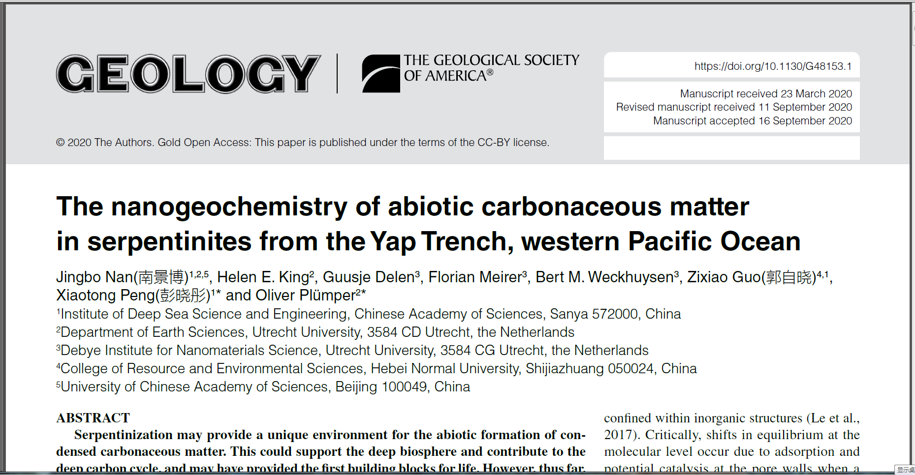 該項(xiàng)研究近期在線發(fā)表于地學(xué)權(quán)威期刊《Geology》,論文第一作者為深海所博士研究生南景博,彭曉彤研究員與烏得勒支大學(xué)Oliver Plümper博士為共同通訊作者(Nan, J., King, H.E., Delen, G., Meirer, F., Weckhuysen., B.M., Guo, Z., Peng, X.*, and Plümper, O.*, 2020. The nanogeochemistry of abiotic carbonaceous matter in serpentinites from the Yap Trench, western Pacific Ocean)。