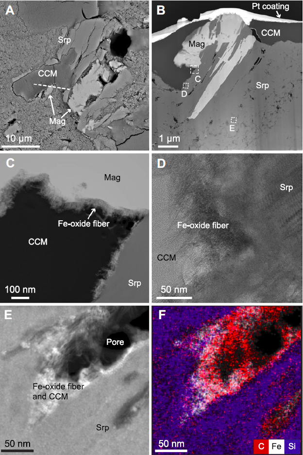 非生物成因有機(jī)質(zhì)(CCM)與鐵氧化物及蛇紋石(Srp)納米孔的空間關(guān)系
