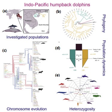 (a)中華白海豚在中國南海西北部雷州灣和三娘灣的種群分布;(b)中華白海豚種群系統(tǒng)發(fā)育樹;(c)中華白海豚染色體演化;(d)中華白海豚的種群動(dòng)態(tài);(e)雷州灣和三娘灣中華白海豚種群與其他哺乳動(dòng)物雜合度的比較