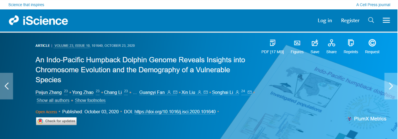 2020年10月3日,深海所李松海科研團(tuán)隊(duì)與青島華大研究團(tuán)隊(duì)合作,在期刊iScience (CELL子刊)在線發(fā)表了題為“An Indo-Pacific Humpback Dolphin Genome Reveals Insights into Chromosome Evolution and the Demography of a Vulnerable Species”的文章。