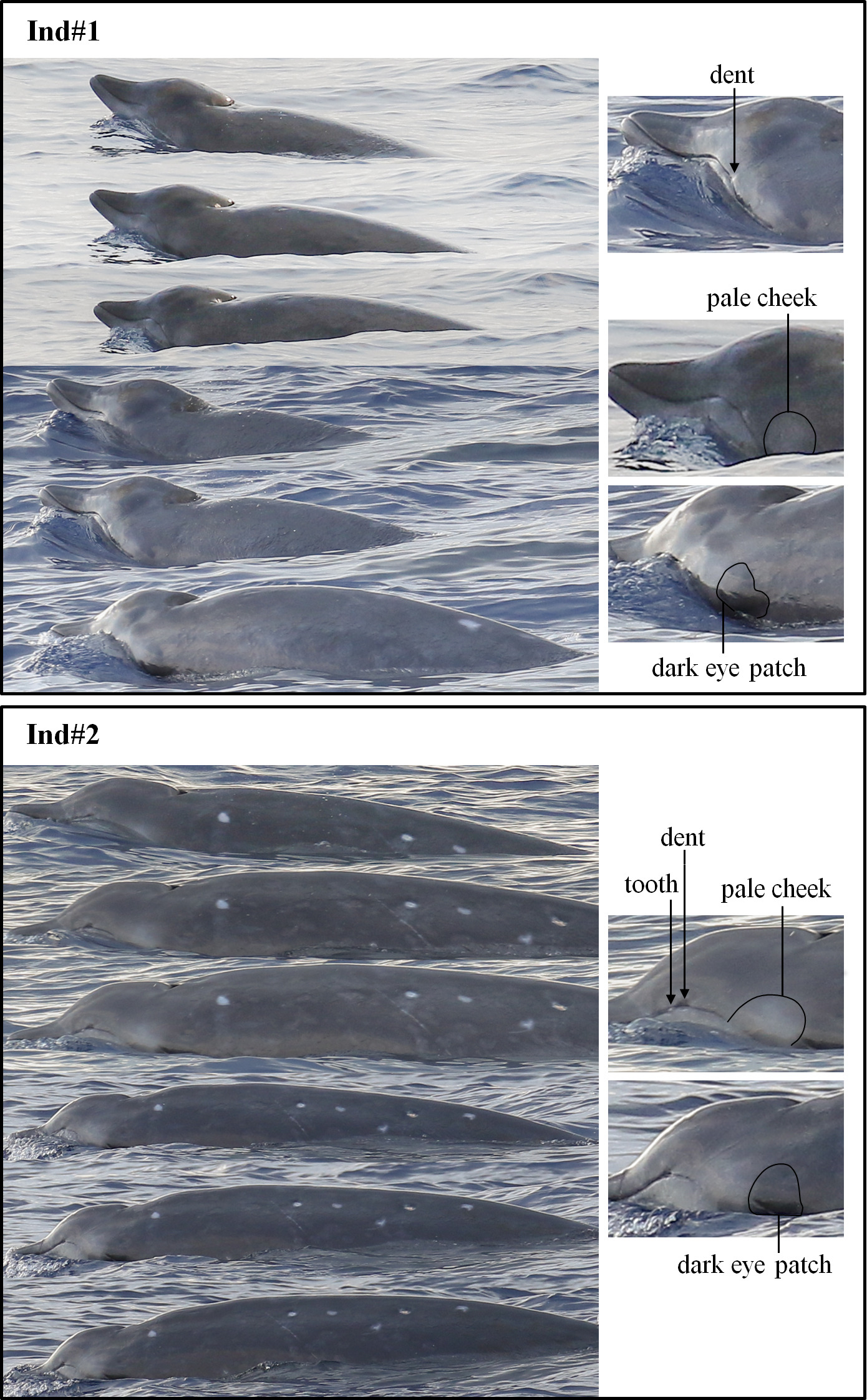 中科院深海所研究團(tuán)隊(duì)在南海目擊到的三頭喙鯨體型相似,視覺上估計(jì)體長有4.5至5米。其中兩頭被拍攝到高清質(zhì)量照片,分別記為ind#1和ind#2。中等大小的鐮狀背鰭位于體長約三分之二處(見圖1);體表背部呈灰褐色;上顎呈褐色沒有白邊;下顎和臉頰呈蒼白色;有輕微的黑眼斑;上嘴唇拱形張口后有小凹痕;ind#2有突出的牙齒(見圖2)。兩頭動(dòng)物體表都有達(dá)摩鯊咬痕,愈合的達(dá)摩鯊咬痕很少有白色愈合疤痕,大多數(shù)愈合疤痕與周圍皮膚的顏色相同(見圖3)。三頭喙鯨同步進(jìn)行了三次連續(xù)潛水(淺潛),第四次為深潛,然后消失。呼吸頻率約為每分鐘10次。此外沒有觀察到其它水面行為。