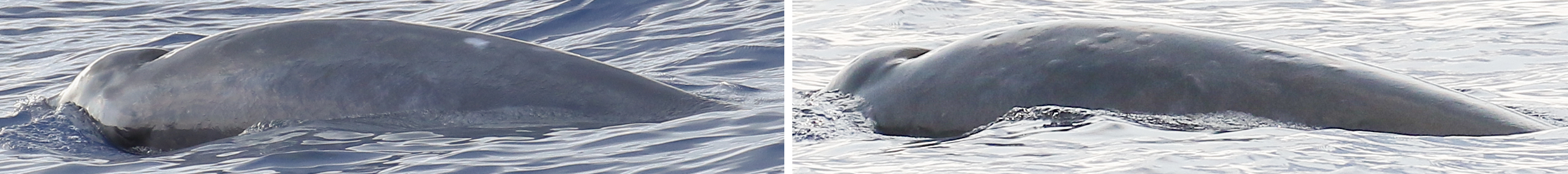 研究人員將本次拍攝到的照片與以往擱淺的銀杏齒中喙鯨和德氏中喙鯨的照片進(jìn)行了比對,獲得了如下認(rèn)識:1)由于頭部和張口形狀以及體色存在差異,銀杏齒中喙鯨和德氏中喙鯨個(gè)體可以很容易地與其它喙鯨種類區(qū)分開來,從外形和膚色來看,本次目擊到的喙鯨應(yīng)該是銀杏齒中喙鯨或德氏中喙鯨;2)盡管在本次研究中收集到的照片數(shù)據(jù)質(zhì)量相對較高,但由于物種之間在體色模式和疤痕模式的高度相似性,因此無法對活體銀杏齒中喙鯨和德氏中喙鯨進(jìn)行準(zhǔn)確分類;3)初步收集到的潛水和浮出水面行為的數(shù)據(jù)與在其它喙鯨中觀察到的數(shù)據(jù)相似,這表明銀杏齒中喙鯨或德氏中喙鯨的遇見幾率和可接近性可能與其它喙鯨類似;4)未來的研究應(yīng)該證實(shí)在銀杏齒中喙鯨或德氏中喙鯨標(biāo)本中的唇線凹痕是否是正常存在。事實(shí)上,唇線凹痕有可能是由于漁具或海洋垃圾造成的。