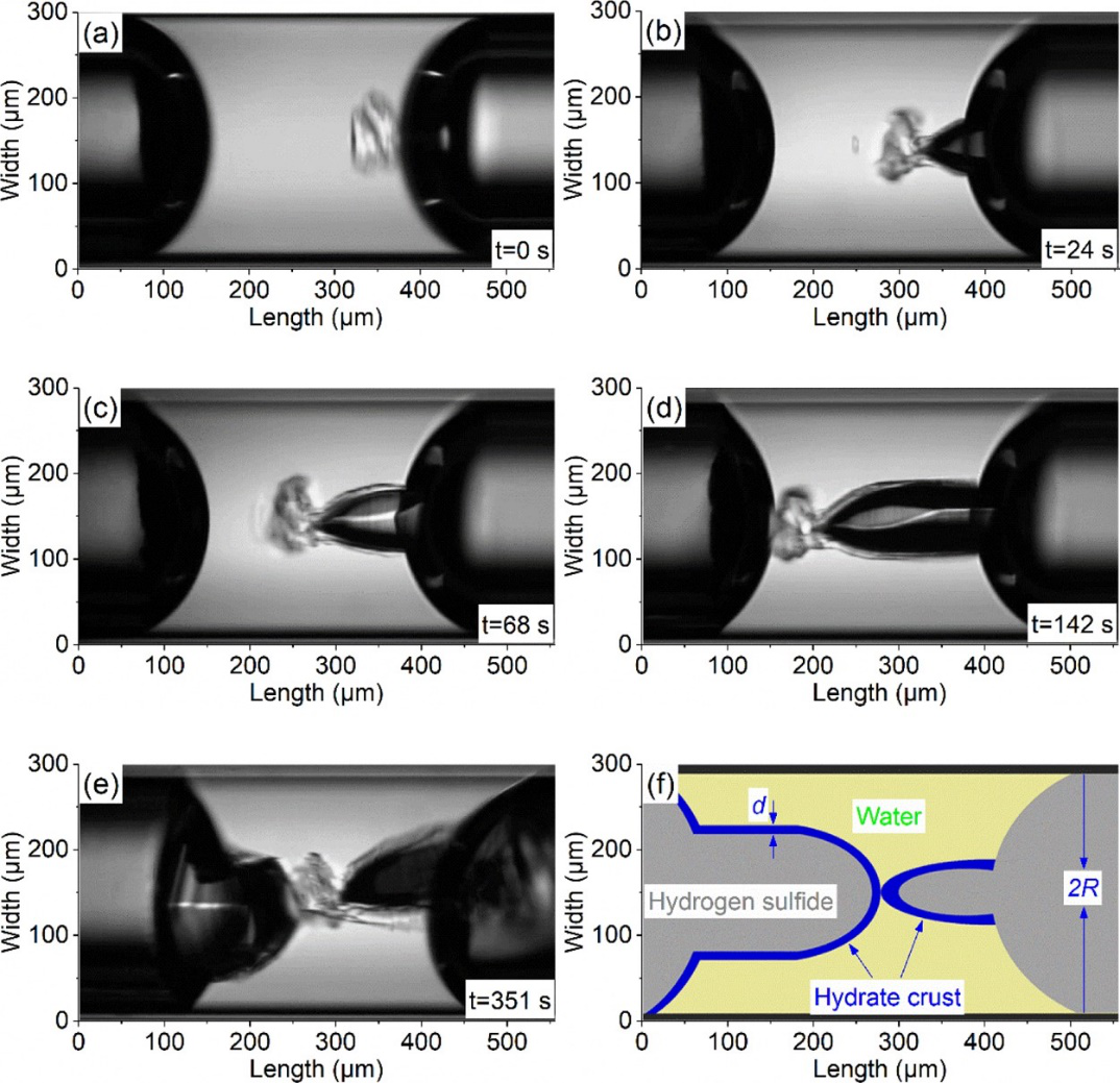 過冷度對(duì)微孔隙內(nèi)水合物的形成特征有較大的影響,高過冷條件下毛細(xì)硅管中水-氣彎液面會(huì)先形成水合物光環(huán),并向兩側(cè)生長(zhǎng),水合物以肉眼不可見的微晶、纖維狀和針狀晶體形態(tài)為主;中等過冷條件下水合物晶體以柱狀多面體和骨架晶體為主,水合物的轉(zhuǎn)化率要低于高過冷條件;低過冷條件下水合物以塊狀多面體形態(tài)為主,包括立方體和八面體。同時(shí),該研究首次發(fā)現(xiàn)微孔隙內(nèi)水合物能夠以“橋接”方式連接。相關(guān)研究成果發(fā)表于《ACS Omega》,“Crystallization Behavior of the Hydrogen Sulfide Hydrate Formed in Microcapillaries”(DOI: 10.1021/acsomega.1c01051)。文章第一作者為深海所博士研究生孫既粵,通訊作者為蔣磊研究員。