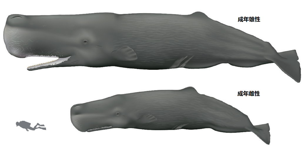 圖2. 抹香鯨雌雄個體的體型差別(圖片來源于書籍:Marine Mammals of the World)