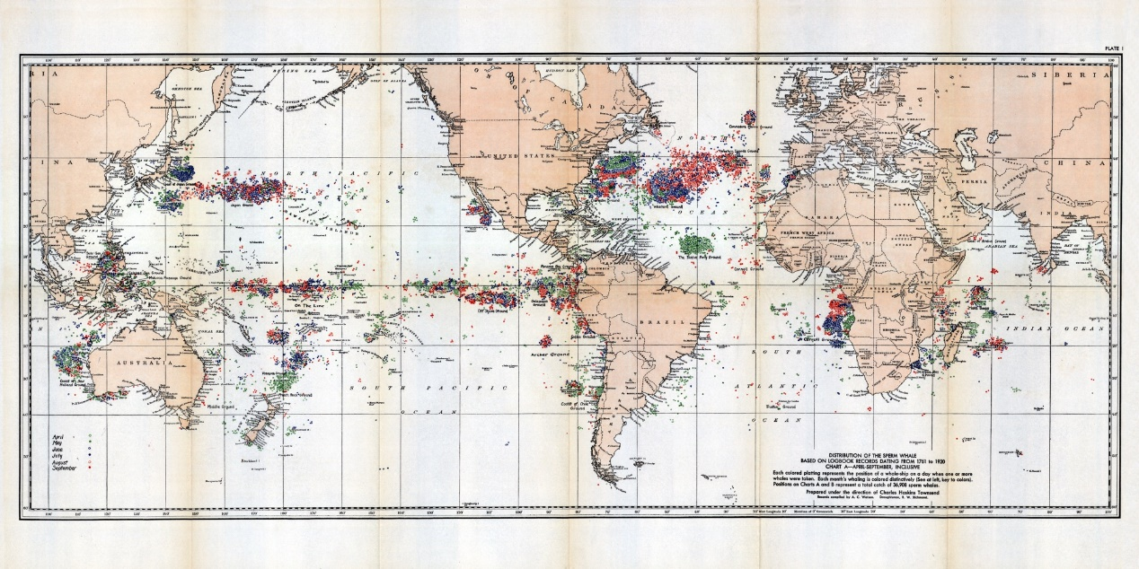 [4] Townsend Charles Haskins. (1935). The distribution of certain whales as shown by logbook records of American whaleships. Zoologica, 19, 1–50.