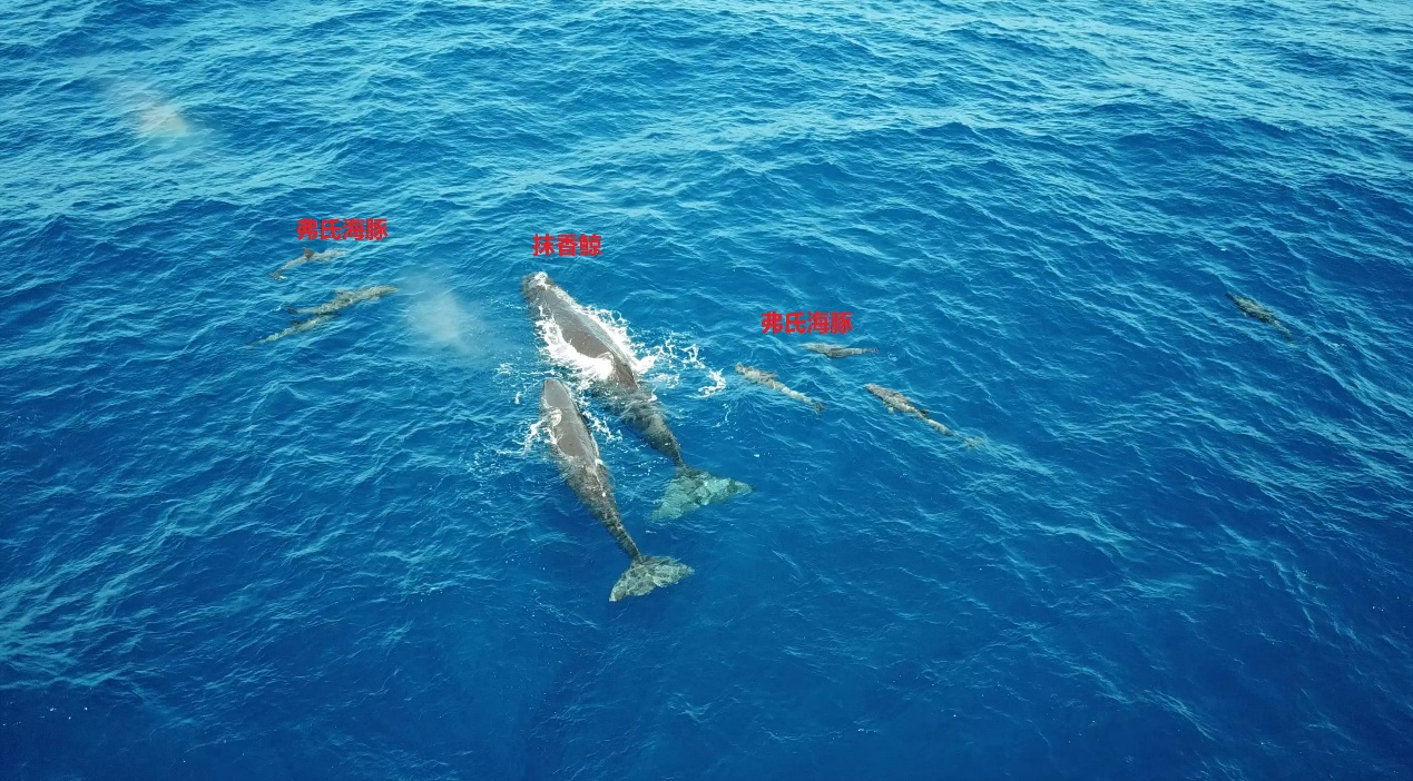 圖9. 南海抹香鯨與弗氏海豚形成的“鯨豚混游”現象(圖片來源:深海所研究團隊;拍攝者:劉明明)