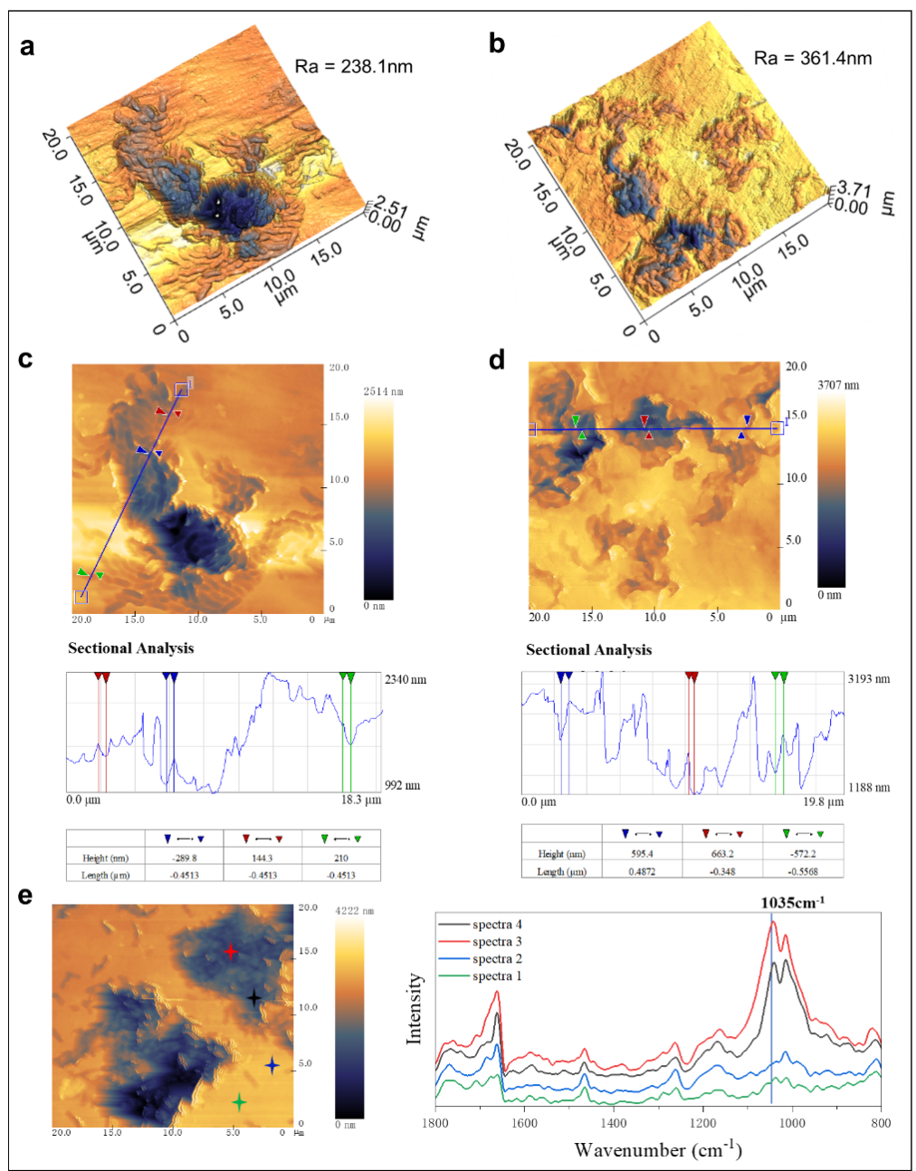 通過光誘導(dǎo)力顯微鏡(PiFM)再現(xiàn)了典型蠕蟲狀結(jié)構(gòu)的三維形態(tài)學(xué)(圖3a,b)。Ra(粗糙度平均值)通常用于指示表面粗糙度。很明顯,降解程度越高的塑料表現(xiàn)出較高的粗糙度。與掃描電鏡(SEM)相比, PiFM在垂直方向上具有更高的準(zhǔn)確度和精密度,可用于探測凹坑的深度。如圖3所示,在相對(duì)早期的降解階段,蠕蟲狀凹坑的寬度約為0.9μm(0.45×2μm),深度約為144.3-289.8nm。隨著降解的發(fā)展,坑深度變大,約為572.2-663.2 nm。