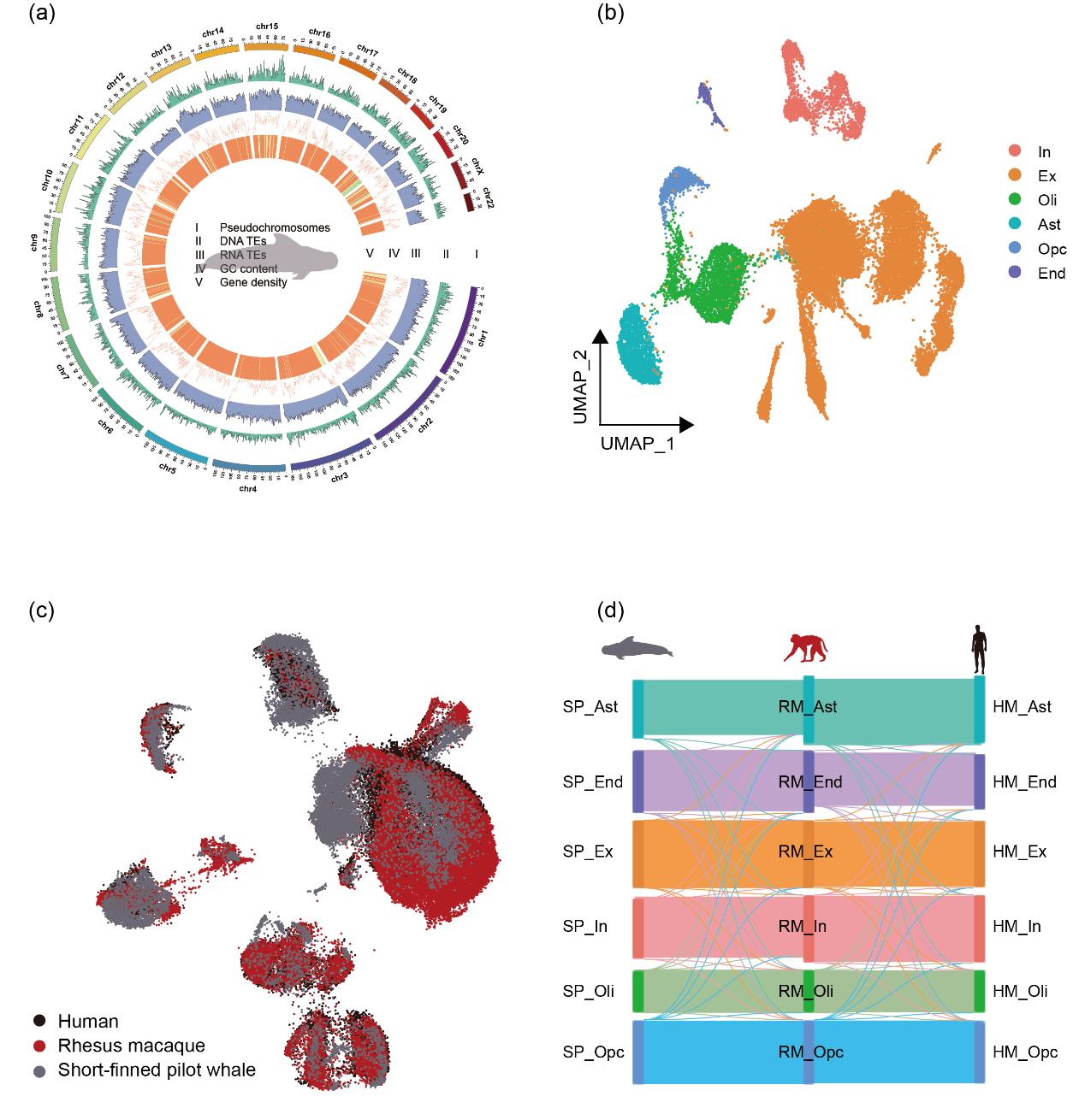 圖1(a) 短肢領(lǐng)航鯨染色體圈圖;(b) 腦皮層細(xì)胞類型的UMAP圖;(c) 短肢領(lǐng)航鯨、人類和獼猴皮層細(xì)胞的UMAP圖;(d) 顯示短肢領(lǐng)航鯨(左)、獼猴(中)、人(右)皮層細(xì)胞類型之間連通性的桑基圖