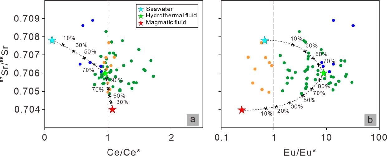 本研究發現U1502B鉆孔蝕變玄武巖中出現的綠簾石脈破碎嚴重,具有再膠結現象和環帶結構,表明在綠簾石脈形成時,鉆孔附近區域構造運動活躍。根據綠簾石的稀土元素和原位Sr同位素組成特征(圖2),可以推測U1502B鉆孔熱液系統的循環流體包括三種類型:(1)改性海水(具有負Ce異常,87Sr/86Sr = ~0.708);(2)高溫熱液(具有正Eu異常,87Sr/86Sr = ~0.706);(3)巖漿流體(具有負Eu異常,87Sr/86Sr = ~0.704),且以高溫熱液流體為主。