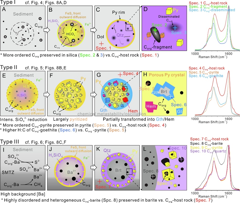 近期,地外海洋系統研究室龍海俊碩士研究生作為第一作者,導師屈原皋研究員作為通訊作者在Precambrian Research(Top期刊)上發表學術論文。本研究以華南新元古代埃迪卡拉地層(約6億年前)中特有的硅質結核為研究對象,綜合運用以拉曼光譜學為代表的微區原位分析方法,發現硅質結核不同種類之間及同種結核之內的有機物存在顯著的光譜特征差異。這些微米尺度有機物分子結構的差異可能記錄了參與硅質結核形成過程中的不同微生物前體和不同生物成礦過程對有機物分子結構的差異性改造。基于微米尺度有機物和礦物的光譜特征差異,本研究提出了不同結核的形成機制,及不同成巖礦化過程對共存的多種來源有機物分子結構的潛在影響。本研究以新元古代地球氧化事件-冰期雪球事件之后、寒武紀生命大爆發之前的地質時期樣品為類比,深入分析深時與深空有機分子生命信號的保存與探測方法,對于類火星硅質沉積以及地外海洋中有機分子和潛在生命痕跡的探測有重要的類比價值。