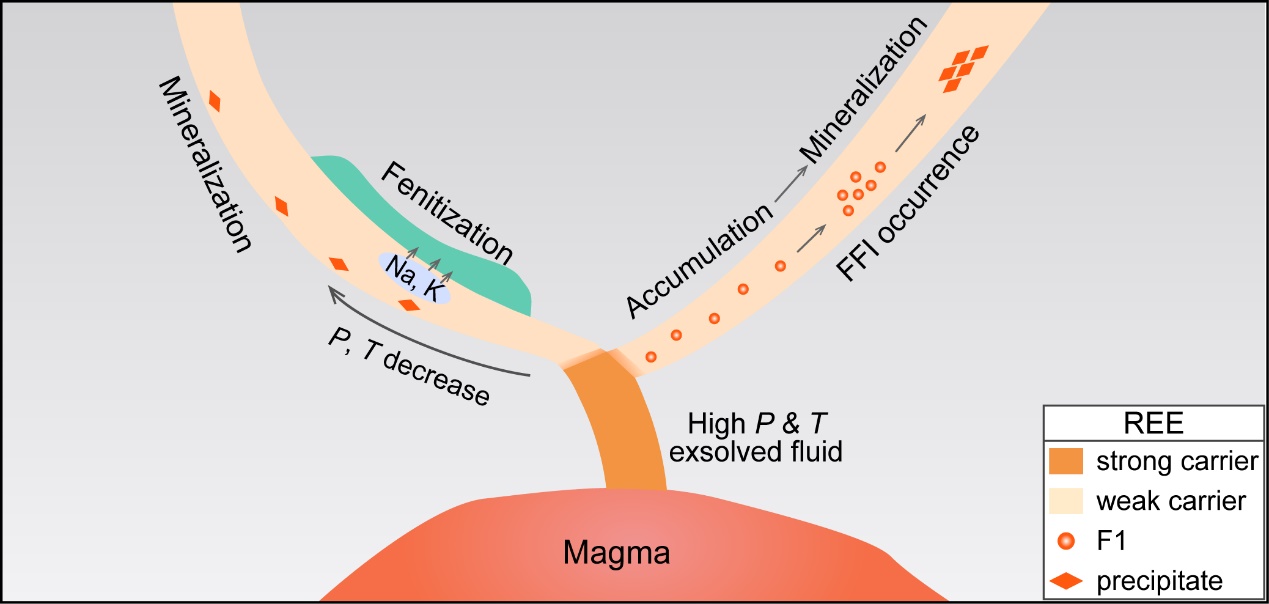 圖2. 硫酸鹽主導的稀土元素遷移、富集、礦化模型(FFI代表液-液不混溶作用,F1指分離出的富集液相)