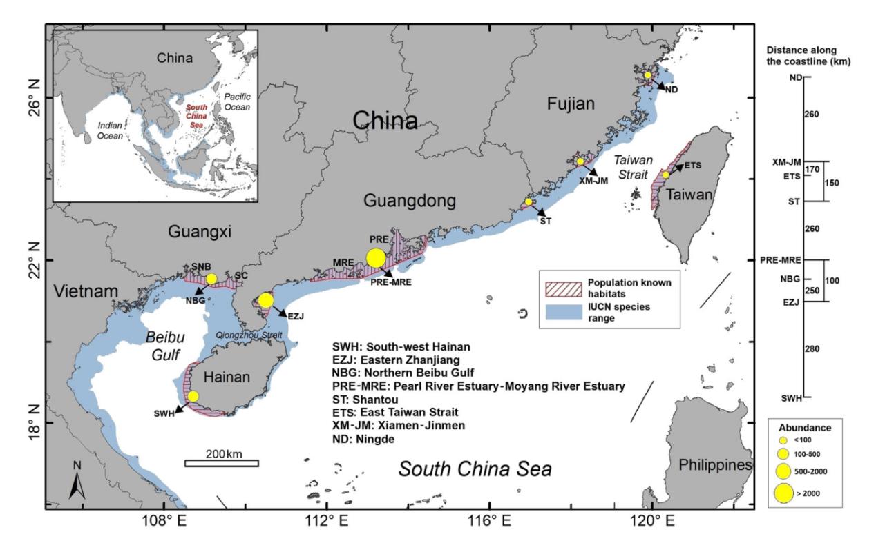 圖1 我國(guó)中華白海豚的棲息分布情況,藍(lán)色區(qū)域?yàn)?/font>IUCN紅色名錄提供的物種分布范圍,紅色區(qū)域?yàn)閷?shí)地調(diào)查確定的棲息地,黃色圓圈顯示了種群規(guī)模,右側(cè)數(shù)字為連接相鄰種群的最近海上距離