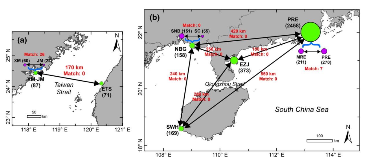 圖2 不同中華白海豚種群/亞種群的照片識(shí)別交叉比對(duì)結(jié)果示意圖:(a)廈門(mén)-金門(mén)和臺(tái)灣西海岸種群;(b) 海南西南部、湛江東部、北部灣和珠江口-漠陽(yáng)江口種群。括號(hào)中的數(shù)字表示各區(qū)域已識(shí)別個(gè)體數(shù)量