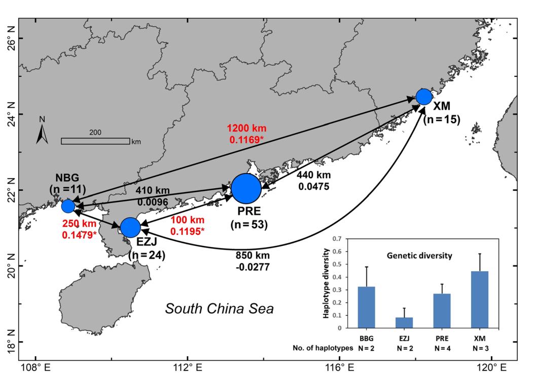 圖3 北部灣、湛江東部、珠江口和廈門(mén)中華白海豚種群分化和遺傳多樣性示意圖。括號(hào)中的數(shù)字表示各區(qū)域采集樣本數(shù)量