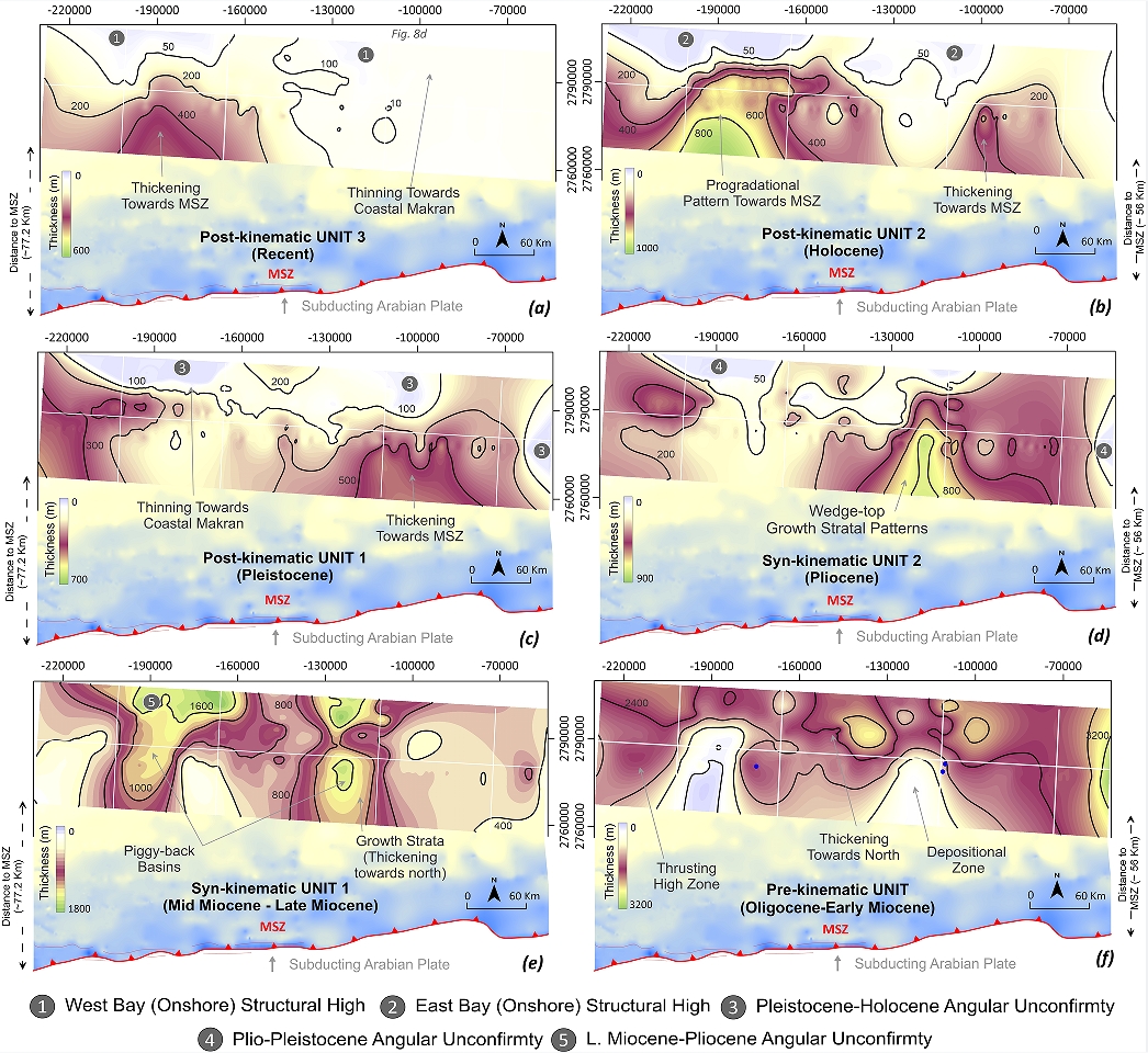 Isopach maps of interpreted stratigraphic units and the location of Makran subduction zone and subducting Arabian oceanic plate show the general distribution and migration of depocenters in time and space.