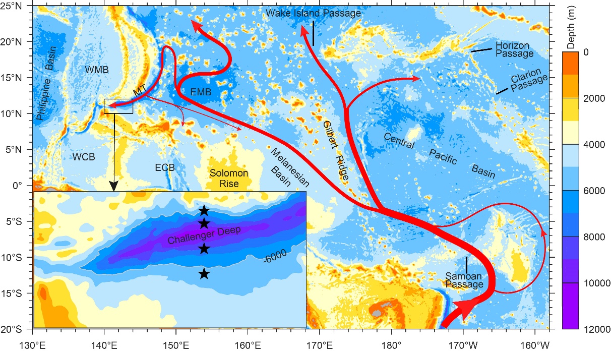 圖1. “挑戰者”深淵位置和潛標站位置、以及西太平洋深層環流示意圖