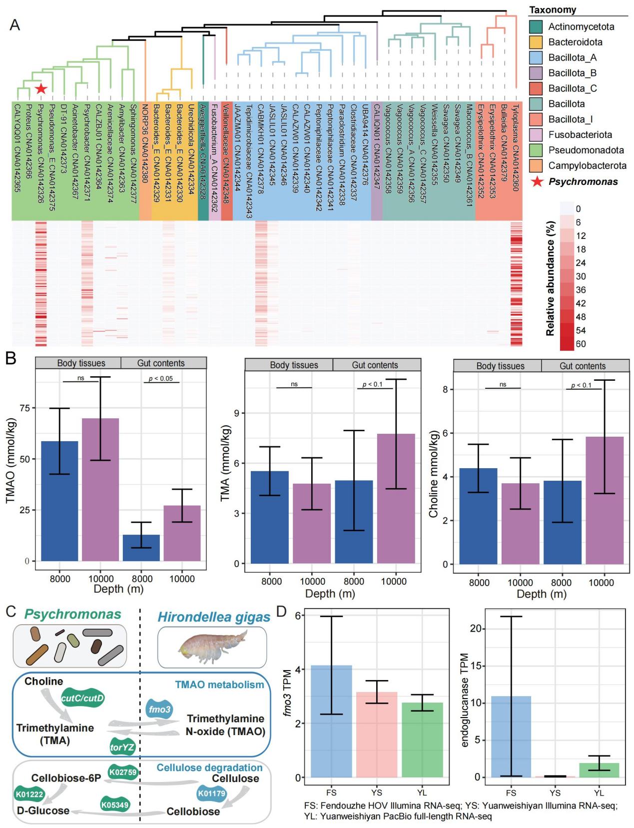 氧化三甲胺(TMAO)是一種滲透調節物質,在滲透壓調節以及在高靜水壓條件下維持細胞完整性方面發揮著重要作用。檢測發現,隨著深度增加,鉤蝦腸道內容物中TMAO濃度顯著升高,體組織中也呈現類似趨勢。鉤蝦自身編碼fmo3基因,可將三甲胺(TMA)轉化為TMAO。而其優勢共生菌Psychomonas的基因組中攜帶cutCcutD基因簇,可將膽堿分解為TMA;同時擁有torYZ操縱子,可以將TMAO還原為TMA,從而調控宿主體內的TMAO濃度,形成動態平衡。