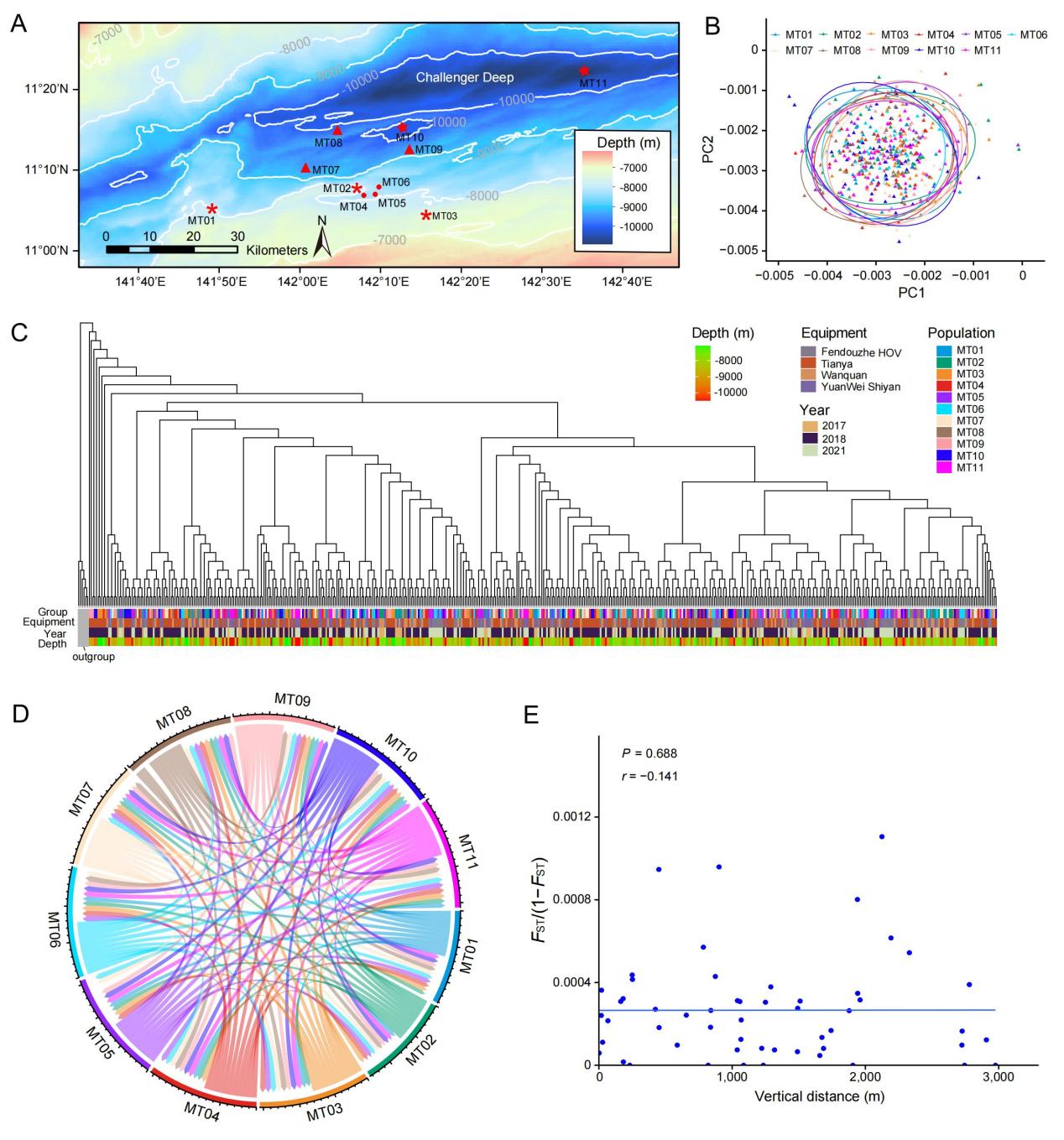 研究團隊對馬里亞納海溝的510只(11個群體)、雅浦海溝94只(1個群體)及西菲律賓海盆深淵區的18只(1個群體)H. gigas個體進行了高覆蓋的全基因組重測序和群體遺傳學分析。結果顯示來自馬里亞納海溝11個不同深度(~7000-11000米)群體不存在遺傳分化,表明生活在馬里亞納海溝內的鉤蝦是一個完全混合的群體,高靜水壓不會限制其在海溝內的垂直遷移。而西菲律賓海盆的鉤蝦群體與馬里亞納海溝的群體則表現出明顯的遺傳分化。這兩個海溝間相隔~1500公里,表明地理隔離阻礙了群體間的基因交流。